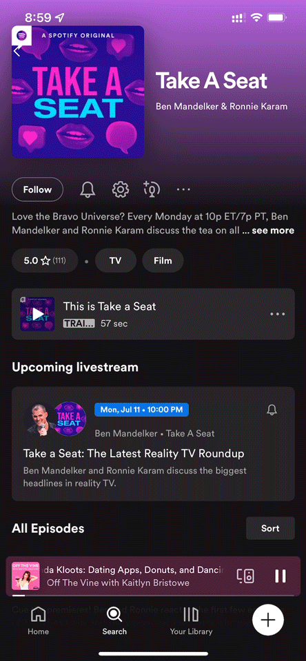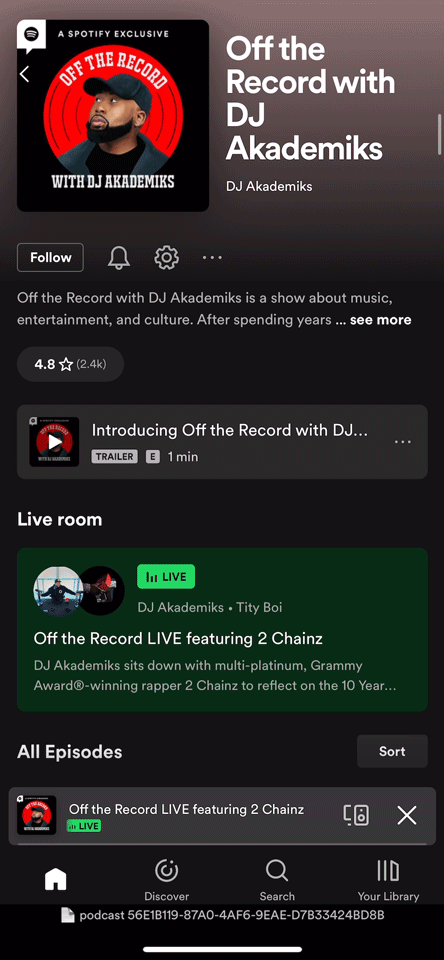 Spotify Live is a tool that allows creators to go ‘live’ and broadcast to fans. To grow MAU for Live content, we sought to integrate the listening experience from the standalone Live app into the main client, scaling the content experience to our existing user base and eliminating the friction of needing to install a separate app to listen.